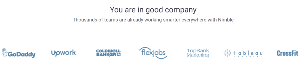 Entrepreneurs and Startups: Nimble provides entrepreneurs and startups with a comprehensive CRM solution to establish and grow their business. It simplifies the management of contacts, streamlines workflows, and facilitates personalized communication. Nimble’s integrations with popular platforms and its ability to consolidate data help entrepreneurs and startups stay organized, build strong networks, and seize opportunities.
